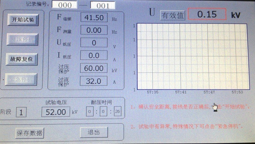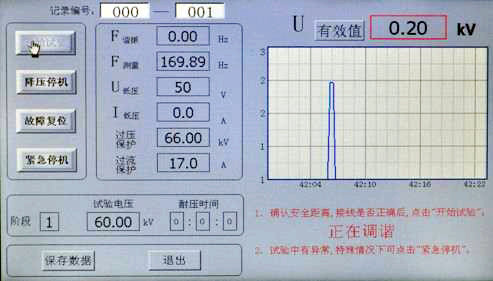 點擊“開始試驗”,系統自動尋找諧振點,右下角提示“正在調諧,如有異常情況,請點擊“降壓停機””;藍代表電壓曲線,顯示界面如圖所示