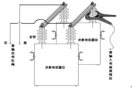 (4)將測試電壓電纜分別夾在被試電容器組兩極的連接母線上,鉗形電流取樣表卡在所需測量的單臺(tái)電容器的套管處;