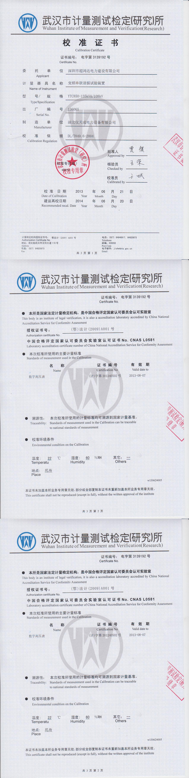 轉(zhuǎn)載:"YTC850系列變頻串聯(lián)諧振試驗裝置資質(zhì)證書" 請注明來源于儀天成電力。 更多技術(shù)問題請致電儀天成電力客戶服務:027-87876585,技術(shù)部專線:027-87876585,在線客服:719388481