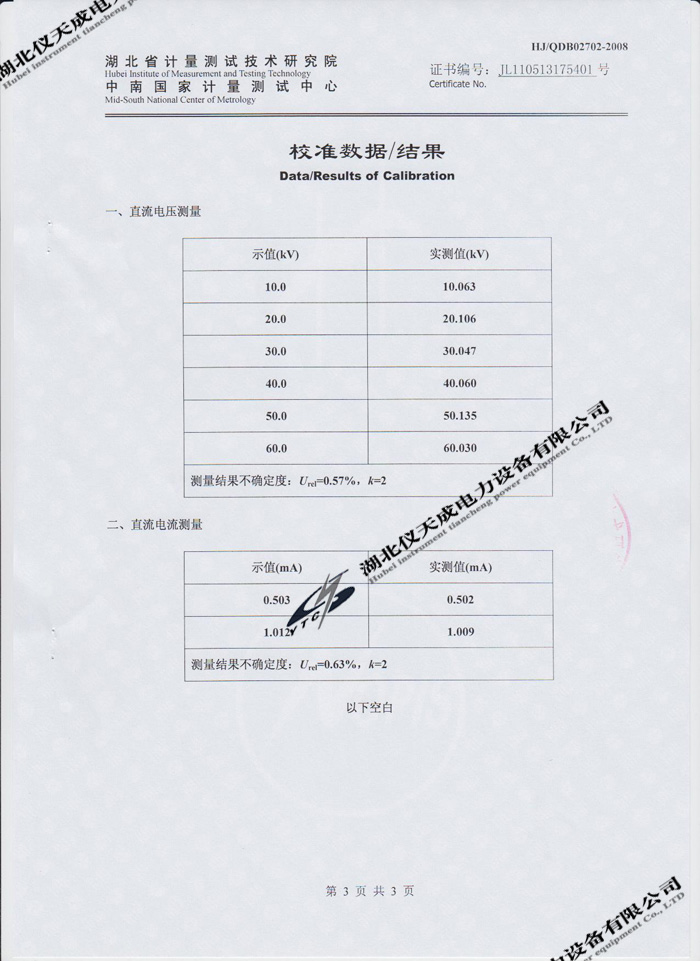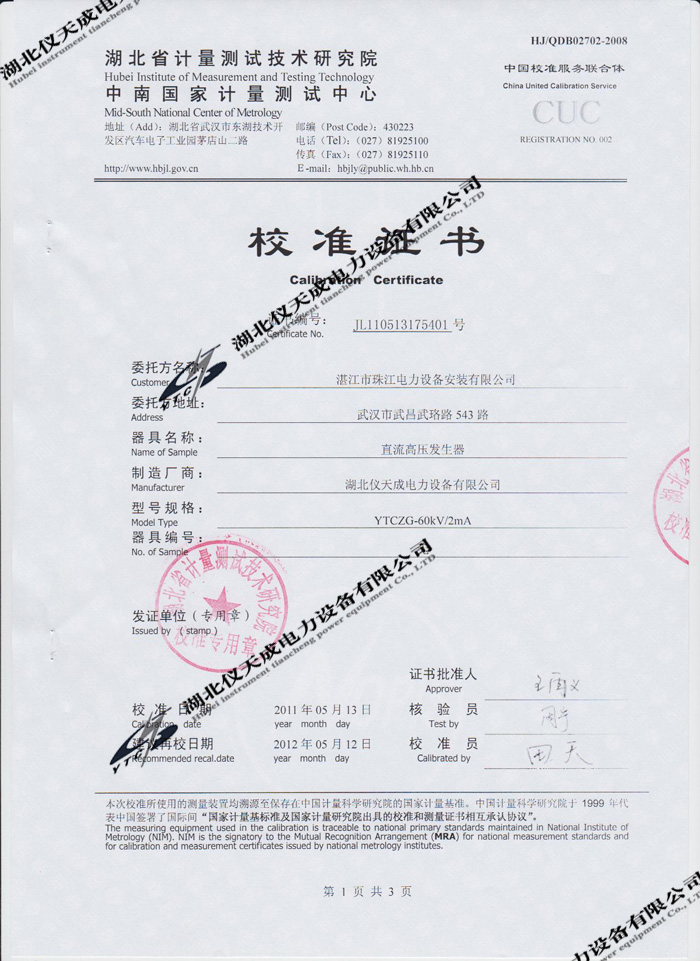 轉載:"YTCZG-60kV/2mA直流高壓發生器的資質證書" 請注明來源于儀天成電力。 更多技術問題請致電儀天成電力客戶服務:027-87876585,技術部專線:027-87876585,在線客服:719388481