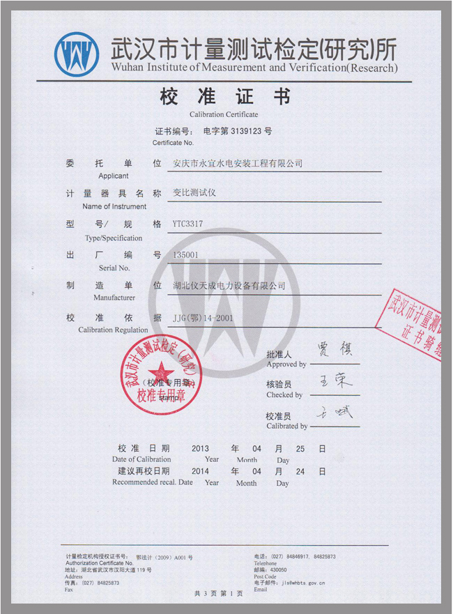 轉(zhuǎn)載:"YTC3317全自動變比組別測試儀鑒定證書" 請注明來源于儀天成電力。 更多技術(shù)問題請致電儀天成電力客戶服務(wù):027-87876585,技術(shù)部專線:027-87876585,在線客服:
